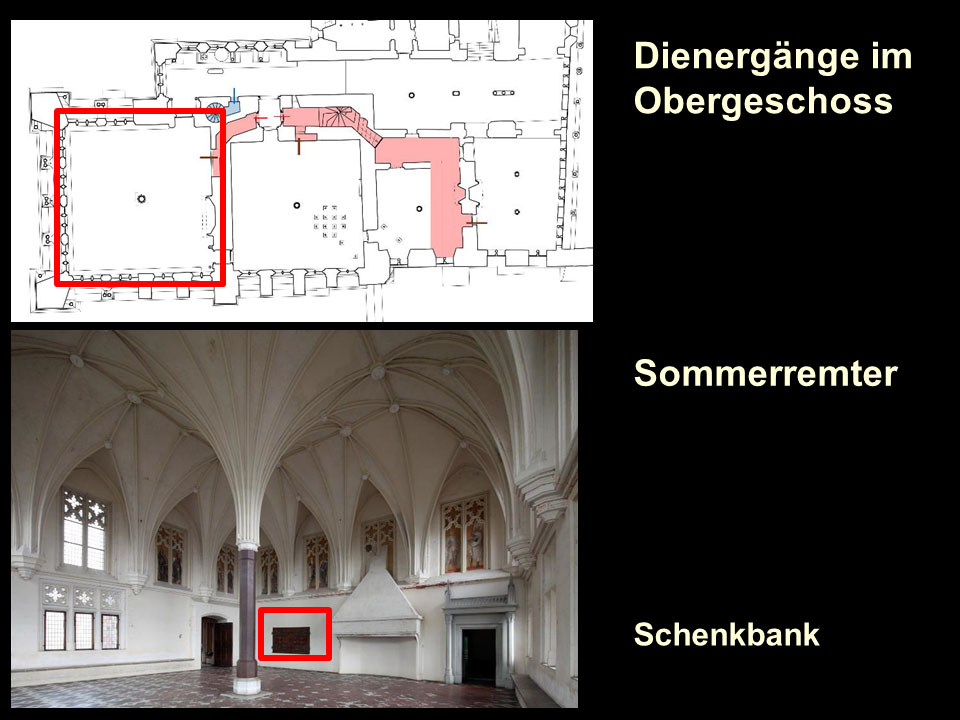 Element jak dotąd nie stwierdzony w świeckiej architekturze europejskiej nigdzie poza Malborkiem stanowi pomysłowy system przejść dla służby na reprezentacyjnej kondygnacji Pałacu Wielkich Mistrzów. (Il. 16) Ukryte w grubości murów przejścia prowadziły do trzech lad szynkowni (Letni Refektarz, Zimowy Refektarz, sala przyjęć), przez które służba piwniczego – niewidoczna dla wielkiego mistrza i jego gości – podawać mogła do sali napoje i słodycze. Z przejścia dla służby szerokie kręcone schody prowadziły aż do piwnicy, gdzie przechowywane były zapasy wina, pitnego miodu i piwa wielkiego mistrza. Lady szynkowni można było zamknąć za pomocą drewnianych skrzydeł, były one otwierane tylko w razie potrzeby. Przed ladami znajdowały się kamienne ławy, na których stała zastawa do jedzenia i trunków. Rozlane płyny odprowadzane były, poprzez rowki na zewnętrznej krawędzi kamiennej płyty, do ołowianych rur wmurowanych w ścianę, które odprowadzały pomyje na zewnątrz. Dla tego rodzaju przemyślanego systemu przejść dla służby dotychczas nie odnaleziono drugiego, porównywalnego przykładu w europejskiej architekturze rezydencjonalnej. Być może w tym wypadku rzeczywiście można mówić o wynalazku autorstwa malborskiego budowniczego, stworzonym na życzenie zleceniodawcy.